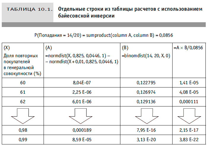 Теперь для каждого значения в исходном диапазоне (и даже немного за его пределами, чтобы получить «хвосты» в уравнении) мы рассчитываем P(Prop = X), P(Попадания = 14/20|Prop = X) и P(Prop = X |Попадания = 14/20), для каждого приращения на 1 % повторных покупателей в генеральной совокупности величина P(Попадания = 14/20) для всех одинакова и равна 8,56 % (см. табл. 10.1).
