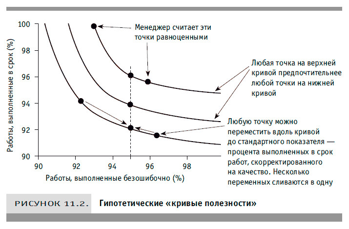 Кривая полезности, обеспечиваемой любыми двумя факторами (например, качеством работы и ее своевременным выполнением или низким риском и высокой доходностью), позволяет упростить выражение ценности комбинации факторов, представленной точкой на графике. Поскольку каждую точку можно перемещать вдоль кривой так, что ее ценность не изменится, можно рассматривать все точки эквивалентными одной, расположенной на единой стандартизированной линии. В этом случае мы стандартизируем качество и выражаем сравнительную ценность любой точки на графике через коэффициент своевременности выполнения работ, скорректированный на качество. Заявив, что «сотрудник, выполняющий безошибочно Х% работ и завершающий в срок Y% заданий, не уступает тому, кто выполняет безошибочно 95 % заданий и в срок ___% заданий», мы фактически свернули две переменные в одну.