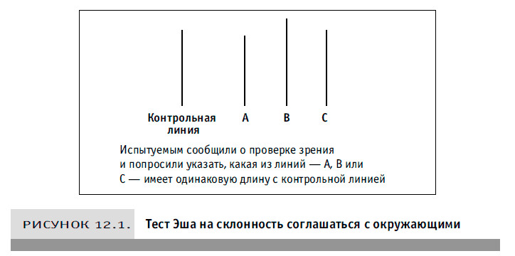 • Стадный эффект, или эффект группового давления. Оказывается, что если вы хотите выяснить мнение экспертов, то лучше опрашивать их по отдельности, а не всех вместе, поскольку в последнем случае возникает дополнительная погрешность. В 1951 г. психолог Соломон Эш предложил группе испытуемых (студентов) проверить их зрение (см. рис. 12.1). Когда он спрашивал каждого в отдельности, длина какой линии ближе всего к контрольному отрезку, то правильный выбор (отрезок С) сделали 99 % испытуемых. Одновременно Эш провел опыт: в комнате находились несколько человек, и каждого из них по очереди просили сделать этот выбор. Однако испытуемые не знали, что несколько первых опрашиваемых сами были участниками эксперимента и их проинструктировали выбрать линию А вместо С. После первого, заведомо неверного, ответа наступала очередь реального испытуемого. Если он слышал перед этим один ложный ответ, то только в 97 % случаев делал правильный выбор. Когда перед испытуемым ложный ответ давали двое или трое, действительные участники делали правильный выбор в 87 и 67 % случаев соответственно. Если же к неверным первым ответам добавлялось некое групповое поощрение (усиливая тем самым давление к проявлению конформизма) на случай, что все участники ответят правильно, только 53 % реальных респондентов выбирали нужную линию С.