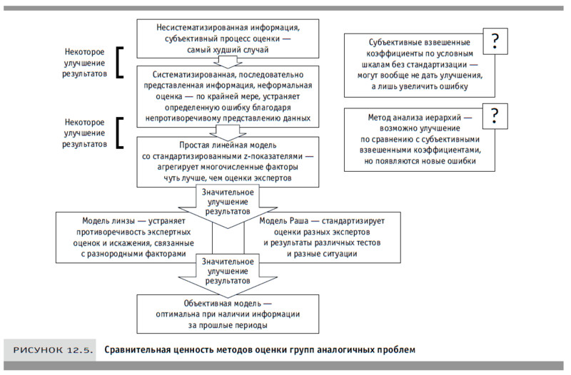 Если модель линзы выявляет корреляцию между исходными переменными и экспертными оценками, то объективная модель находит связь между этими переменными и фактическими результатами прошлых периодов. Во всех случаях применения модели линзы, перечисленных в рисунке 12.2, на основе прошлой информации была построена регрессионная модель. Например, врачам были предоставлены медицинские данные о больных раком, а затем на основе оценок их ожидаемой продолжительности жизни была построена модель линзы. Но помимо этого за пациентами продолжали наблюдать и определять их фактическую продолжительность жизни. И если погрешность результата, полученного с помощью модели линзы, оказалась всего на 2 % меньше человеческого суждения, то ошибка оценки на базе объективной модели была меньше уже на 12 %. Средняя погрешность оценок, полученных во всех случаях применения модели линзы (см. рис. 12.2), была на 5 % меньше ошибки мнений экспертов, а средняя ошибка объективной модели – на 30 %. Конечно, даже объективные линейные модели не являются панацеей от всех бед. Как мы говорили в предыдущих главах, обычно дальнейшее разложение задачи на составляющие позволяет снизить неопределенность еще больше. Если бы мы расположили все эти методы в определенном порядке, так, чтобы на одном конце спектра оказались простые экспертные оценки, а на другом – объективная линейная модель, то получили бы следующую картину (см. рис. 12.5).
