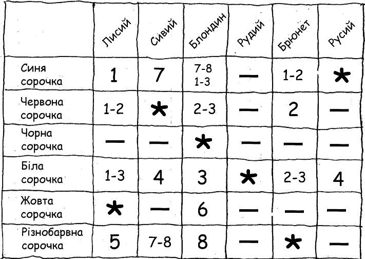 – Пункт перший заперечує, що на лисому була синя сорочка, тому в чарунці на перетині граф «лисий» та «синя сорочка» ставимо цифру один. Пункт сьомий заперечує, що синя сорочка була на сивому, тому в чарунку на перетині «сивого» та «синьої сорочки» ставимо цифру сім. І так далі. Так ми з'ясовуємо, що на блондині була чорна сорочка. Тому фіксуємо цей факт у чарунці на перетині «блондина» та «чорної сорочки», намалювавши там зірочку. І оскільки на решті пасажирів сорочки не чорні, і пасажири в інших сорочках не блондини, то ставимо у відповідних чарунках прочерки чи знаки «мінус». Продовжуючи діяти таким чином, шляхом виключення, приходимо до такого результату.