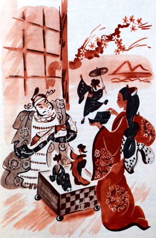 Жена Таро вынула из рукава шкатулку, открыла ее, и тотчас выпрыгнули из шкатулки сто актеров в одинаковых кимоно и хакама, стали петь и танцевать. Очень понравился князю простой фокус, и приказал он показать сложный.