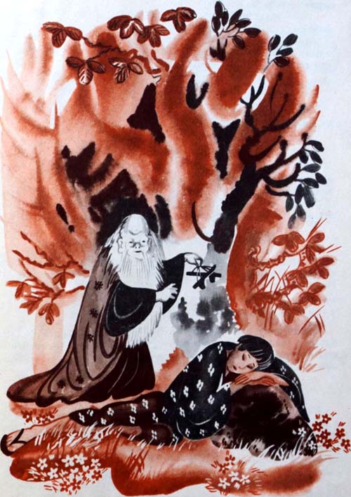 Поплелся Косукэ домой, а по пути в лес зашел. Сел там и стал думать, как ему быть. Думал, думал, да и задремал нечаянно. И явился ему во сне старичок седой, добрый на вид.