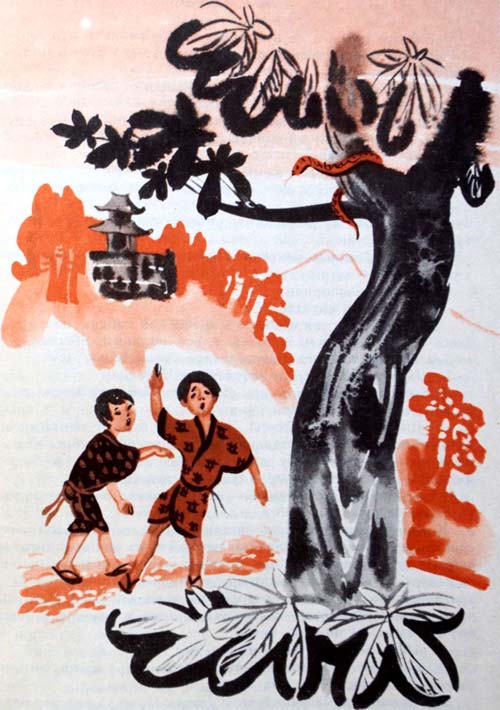 Они отошли к храмовым ступеням и присели там. Ветка, на которой лежала змея, была видна и оттуда. Мальчики устали от всей этой суматохи и захотели немного отдохнуть. Ребята никак не возвращались. Дзэнта посмотрел на дерево: змея, вытянувшись, ползла по ветке к стволу каштана. И когда только она успела? Что же делать? Что делать?