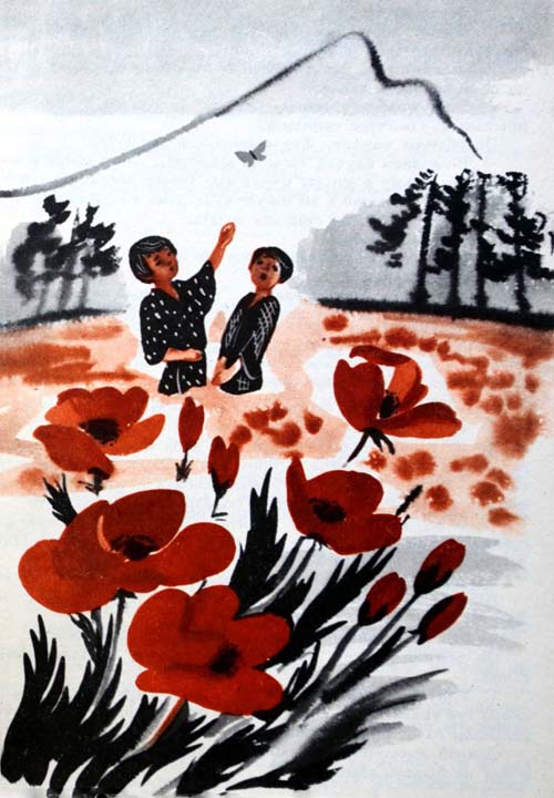 Сампэй хотел еще раз посмотреть на бабочку, но она вдруг вспорхнула с коробочки мака, чуть не хлопнув Сампэя по носу своими маленькими крыльями. А если бы у него случайно был открыт рот, она влетела бы прямо туда.