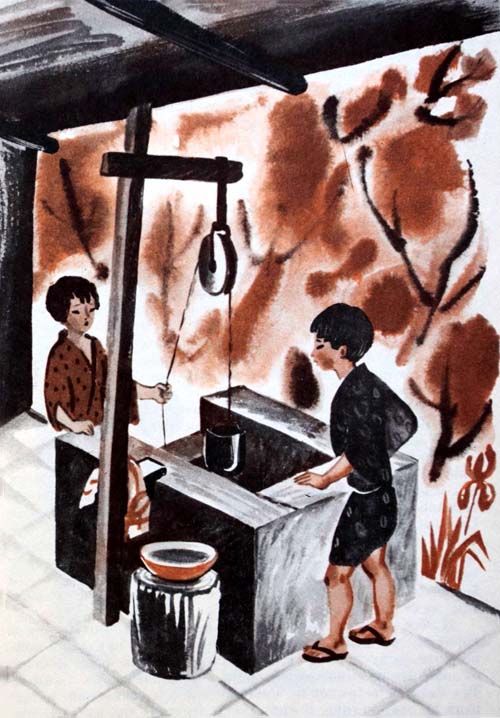 Сампэй не мог больше оставаться на месте. Он огляделся: неподалеку были мостки для стирки белья. В глаза ему бросилась деревянная бадья, наполовину наполненная водой. Вот это интересно!
