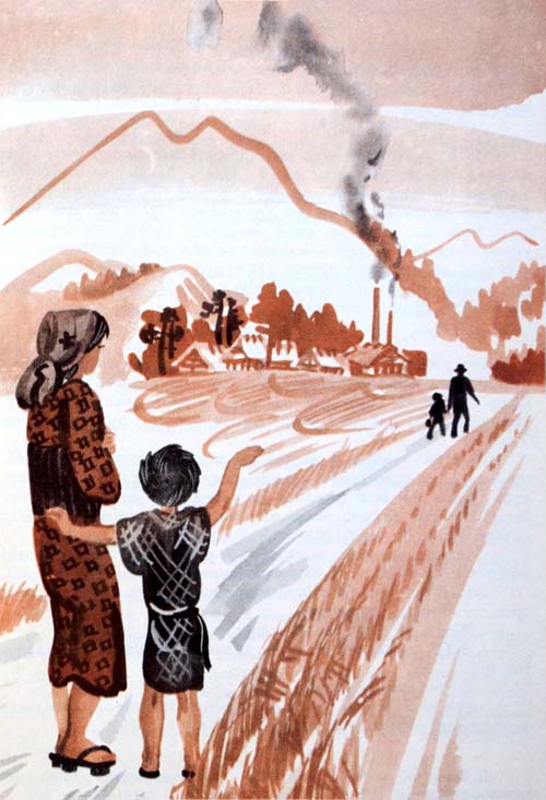 Взявшись за руки, они идут по дороге. Сампэю очень хочется пить, но он терпит.