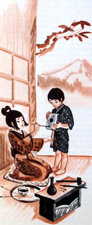 – А что же еще! – сердится Косукэ, но сердце его сразу же смягчается, как только он вспоминает, что этот домик будет висеть на ветке дерева и станет жильем для птиц. И он говорит сестре: – Миёко, напиши на нем иероглифы. А?