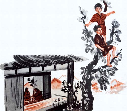 – Врешь! – не верит Гиндзиро. – Забраться на дерево, держась одной рукой, никто не сможет. Правда, Кин-тян?