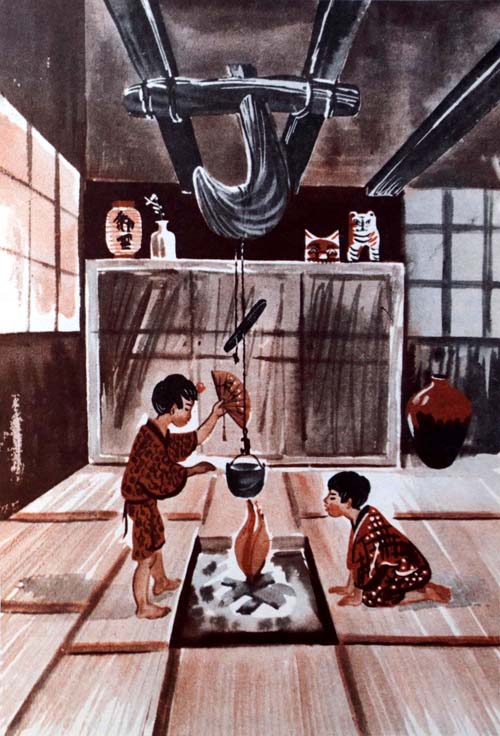 Наконец щипцы находятся, горящие головешки перенесены в печку, угли положены, кастрюля поставлена. Сампэй бежит спросить, что делать дальше.