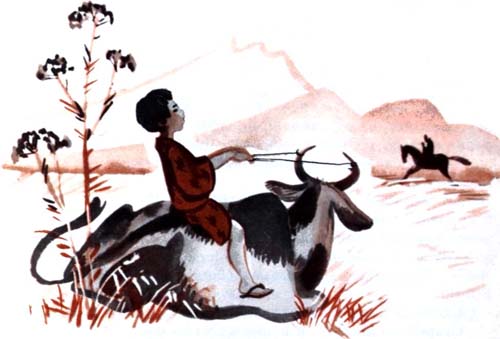 Отец с матерью запретили ему кататься на лошади. Выходит, он должен играть один. А раз так, то он будет ездить верхом на корове. Теперь он выбрал спокойную черно-белую корову по кличке Сиро яма. Взял веревку и привязал ее концы к обоим рогам. Вот и вожжи.