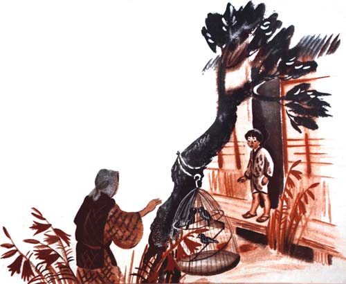 С трудом прогнав кошку, она вдруг подумала: «А что, если повесить клетку с птицами на ветку груши? Увидят Дзэнта и Сампэй, вот удивятся-то, вот обрадуются!» Однако до ветки старушка не дотянулась. Привязала клетку веревкой к стволу. И тут дверь прихожей отворилась и вышел Сампэй. Что это? Какая-то странная старушка копошится у груши! Сампэй изумленно остановился. А старушка, улыбаясь, уверенно окликнула его:
