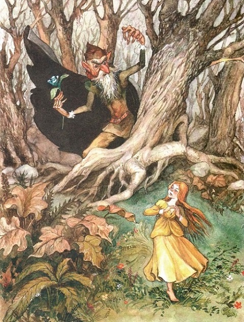 Между тем старики крестьяне стали совещаться с мудрой, много повидавшей на своём веку женщиной. Она убеждала стариков привести к Джеммине ещё до заката человека, наделённого волшебной силой. Только он сможет разрушить злое колдовство Чёрного Странника. Но где найти такого человека?