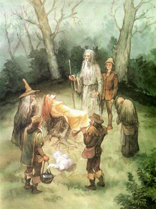 И вот спустя некоторое время у могучего пня, на котором лежала Джеммина, собрались странные люди, одетые самым причудливым образом.