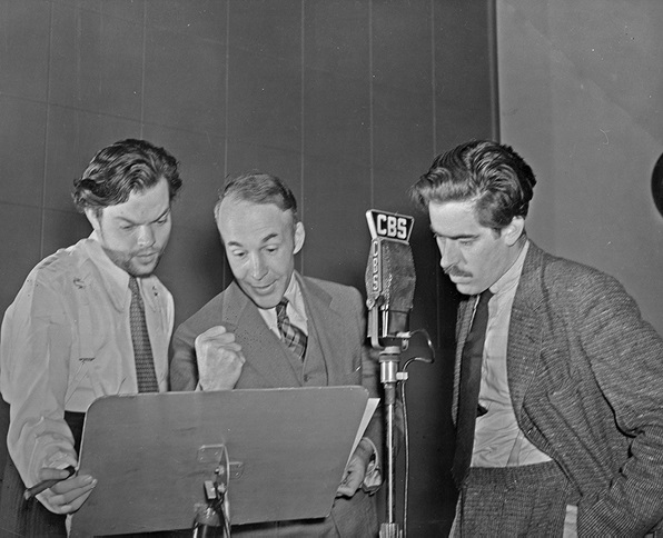 Ил. 3. Орсон Уэллс, Арчибальд Маклиш и Уильям Робсон на репетиции радиодрамы «Воздушный налет», 1938 год. (Предоставлено Нью-Йоркской публичной библиотекой, Библиотекой исполнительских искусств, Театральная коллекция Билли Роуза)