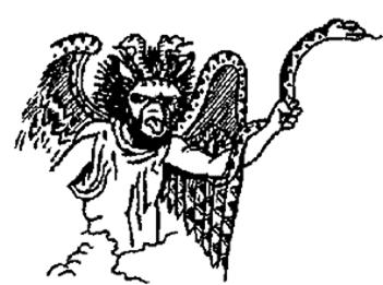– Спасибо, дорогая. Посмотрим, посмотрим… А-га! Вот и он. Демон Тухулка, в сопровождении Тезея и Пирифоя, фрагмент настенной росписи гробницы в Корнето. Вы только гляньте на его лицо! Ну и ну! Как видите, Тухулку изображали получеловеком, полуптицей, с чудовищной бородатой головой, острым клювом, вроде как у стервятника, ослиными ушами, а в волосах его кишат гадюки. За спиной – два огромных кожистых крыла, а вокруг руки кольцами обвилась змея, изрыгающая жидкое пламя.