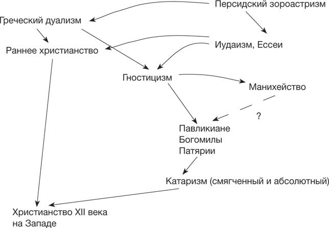 Линии влияния, показанные здесь, чрезвычайно схематизированы, и отношения между этими расплывчато определенными системами были гораздо более сложными. Гностицизм и, вероятно, манихейство оказали влияние на более поздние дуалистические секты, среди которых были павликиане из Малой Азии, богомилы из Болгарии и патарены из Иллирии, но линии родства между этими группами никогда не были четко установлены. – Прим. авт.