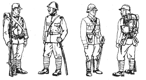 Офицеры и рядовые периода Второй мировой войны. Офицер справа облачен в тропический мундир и пробковый шлем. На голове у рядового справа – тропический вариант полевого кепи