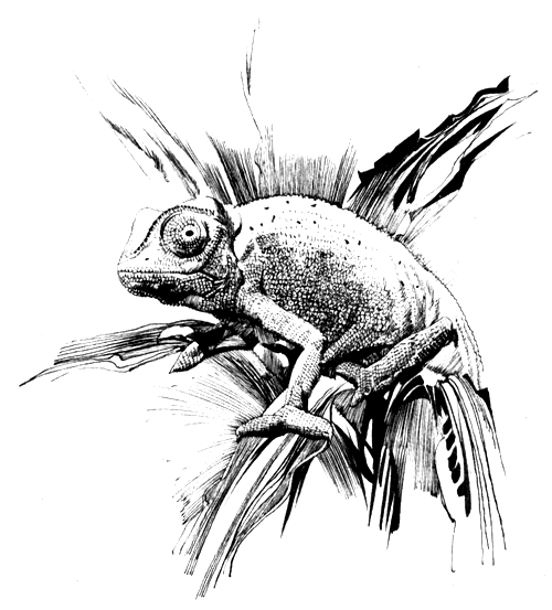 Среди рептилий наиболее известен своей покровительственной окраской, конечно же, хамелеон, благодаря способности так быстро менять цвет своего тела. На коричневой ветке он коричневый, а потом, когда он перебирается с нее на ветку с зелеными листьями, вы увидите; как у вас на глазах постепенно становится зеленым. В данном случае способность его сливаться с фоном, разумеется, преследует две цели: она защищает его от врагов и делает практически невидимым для насекомых, которыми он питается.
