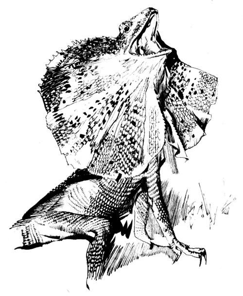 Многие животные носят причудливый наряд в виде шипов или рогов, наростов или складок. Эти странные украшения носят по разным причинам, и у каждого животного есть свои причины. Совершенно фантастические варианты украшений встречаются у рептилий; подобные украшения обычно служат двум целям. Возьмите, например, плащеносную ящерицу из Австралии. У этой странной на вид рептилии вокруг шеи широкая складка кожи, похожая на довольно неопрятный отложной воротник, в спокойном состоянии она сложена вдоль шеи, но когда ящерице угрожает опасность, животное поворачивается навстречу хищнику, широко раскрывает пасть (изнутри ярко-желтого цвета), и расправляет вырост вокруг головы. Из-за этого она выглядит в два раза больше и в два раза свирепее, и, как правило, хищник дважды подумает, прежде чем напасть на нее.