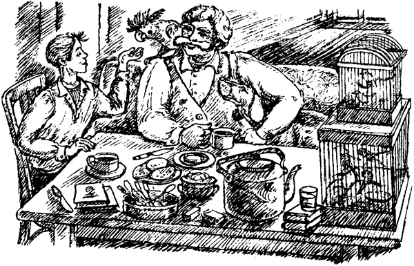 Мы ждали, и короткое ожидание показалось нам вечностью. По мере того как мои глаза свыкались с полумраком, я рассмотрел маленький прилавок и за ним – полки с птичьим кормом и другими вещами, потребными для птицеводства, а перед прилавком стояли на полу большие мешки с коноплей, просом и рапсом. На одном из мешков восседала, торопливо уписывая семена, белая мышка, чем-то похожая на нервно покусывающего соломинку участника званой вечеринки. Я уже подумывал о том, чтобы открыть дверь, чтобы снова зазвенел колокольчик, когда в глубине лавки распахнулась другая дверь и в нашу сторону важно направился, виляя хвостом, почтенного возраста большой охотничий пес, сопровождаемый, как я понял, Генри Белоу, высоким тучным мужчиной с седой кудрявой шевелюрой и густыми колючими усами, напоминающими куст можжевельника, в котором могла удобно обосноваться целая стайка птиц. Из-под косматых бровей сквозь очки в золотой оправе на нас смотрели синие, как барвинок, маленькие яркие глаза. Он двигался с тяжеловесной медлительностью, словно ленивый тюлень; подойдя к нам, приветственно наклонил голову.