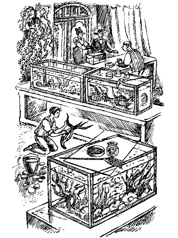 И он запорхал по своему магазину, размахивая руками, словно бабочка крыльями, показывая, как следует чистить аквариум, как кормить мучными червями лягушек и жаб, где лежат щетки и стоят метлы. В просторном подвале под торговым залом хранился различный рыбий корм, лежали сачки и прочие вещи; из неплотно завернутого крана вода капала в большой таз, где лежало нечто, на первый взгляд напоминающее сырое баранье сердце. Присмотревшись, я понял, что передо мной сплошной клубок тоненьких трубочников. Эти ярко-красные черви – излюбленный корм не только всех рыбок, но некоторых земноводных и пресмыкающихся. Далее я обнаружил, что в дополнение к восхитительным созданиям, демонстрируемым на витрине, магазин располагает множеством другой живности. Тут были ящики с жабами, ящерицами, черепахами и лоснящимися змеями, аквариумы с глотающими воздух влажными лягушками и тритонами с фестончатым гребнем вдоль хвоста, похожего на вымпел. Живя уже не один месяц в пыльной, сухой лондонской среде, я ощутил себя здесь словно в райском саду.