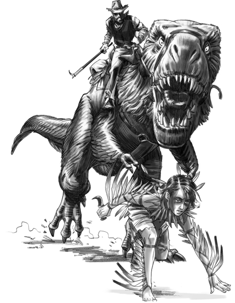 Хейтер в ярости вонзил каблуки в бока тиранна, тянул поводья во все стороны и снова и снова наносил удары крюком по шее Чудовища, каждый раз разрывая кожу и задевая нервные окончания. Завру было очень больно, его словно било током. Чудовище пошатывался, пытаясь сбросить людей, размахивая хвостом и вынуждая тенезавров отпрыгивать в стороны. Картер уже не мог больше прятаться под животом завра и выскочил оттуда, когда тиранн встал на дыбы. Огромный завр поднялся высоко над землей и вновь опустился на ноги. Хейтера тряхнуло вперед, он выпустил поводья и почти выскользнул из седла, но опять ударил тиранна крюком по шее и не стал его вытаскивать.