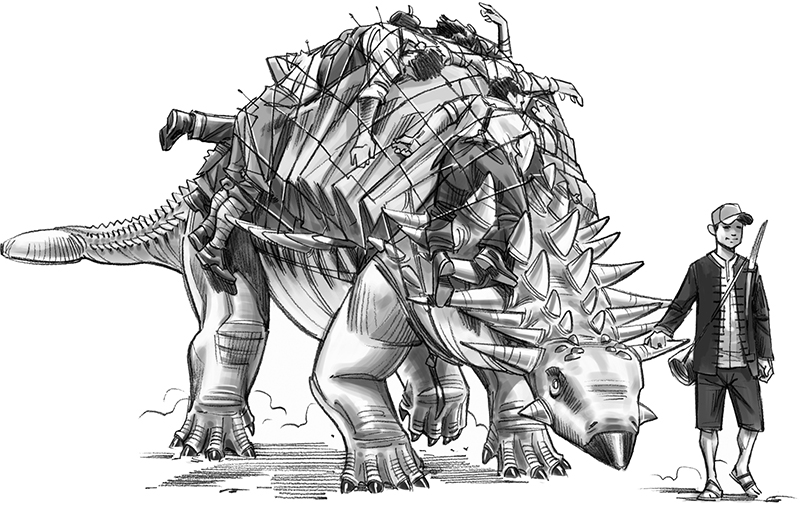 Чудовище широко раскрыл пасть и издал пронзительный рев, от которого кровь стыла в жилах. Перья у тенезавров задрожали. Но мальчик стоял неподвижно, как и раньше, и пристально смотрел на тиранна. Вдруг он что-то заметил в его пасти. Мальчик глянул вниз на Би, а потом сузил глаза и вновь стал смотреть на тиранна, который уже перестал угрожающе рычать.