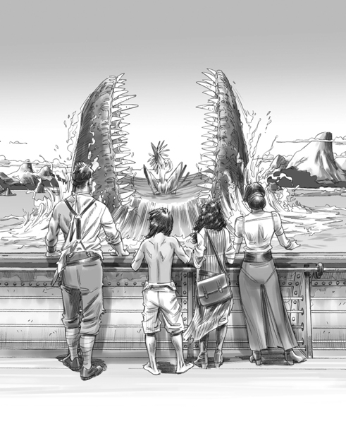 Чудовище еще раз посмотрел на людей, собравшихся на пристани, а потом на корабль. Подпрыгнув, как сжатая пружина, он понесся мимо людей на причал. Толстые деревянные доски трещали и ломались от его мощных прыжков. Теодор понимал, что сейчас произойдет, и крепко обнял Банти. Би схватила Картера за одну руку, а на другую накинула веревочную петлю, чтобы привязать его покрепче.