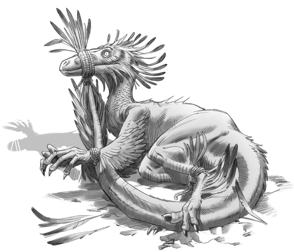 Раптор высвободил одно крыло из-под колена человека и начал хлопать им изо всех сил, пытаясь вырваться и поднимая клубы пыли. Вокруг полетели перья. Мужчина посильнее придавил коленом спину животного, чтобы оно перестало шевелиться. Теодор завязал петлю, набросил ее на морду завра и пять раз обмотал вокруг пасти.