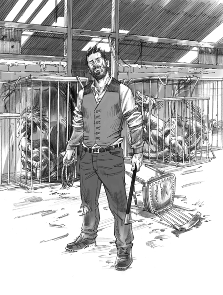 Теодор был не из тех, кто способен оставить ближнего в беде. Он тут же распахнул двери. Помещение было огромным. Вдоль стен один на другом стояли деревянные ящики и металлические клетки всевозможных размеров. Их обитатели тщетно пытались вырваться. Посередине в луче яркого света, проникавшего сюда через маленькие окошки, стоял на коленях коренастый мужчина. Одной рукой он крепко держал голову крупного серого раптора. Свободной ногой животное скребло по полу, оставляя когтем большого пальца глубокие царапины на изрытом ямами полу. Оно отчаянно пыталось нащупать опору, чтобы встать. И завр, и человек были в изнеможении, им явно требовалась помощь.