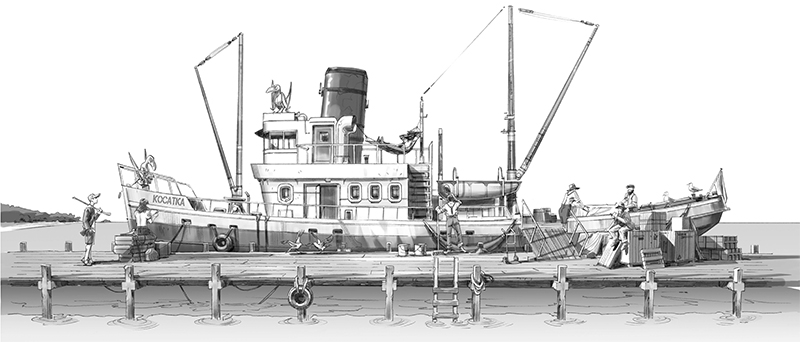 После разгрузки судно стало значительно легче и теперь возвышалось над пристанью. Один из матросов попытался отскрести полоски грязи по бортам жесткой щеткой на длинной палке, но потом бросил это занятие, тем более что капитан еще не проснулся. Чайки c важным видом прогуливались вразвалочку неподалеку в надежде чем-нибудь поживиться. Над «Косаткой» кружили зубастые птерозавры, наблюдая сверху за чайками и поджидая, пока те забудут об осторожности и подойдут ближе.