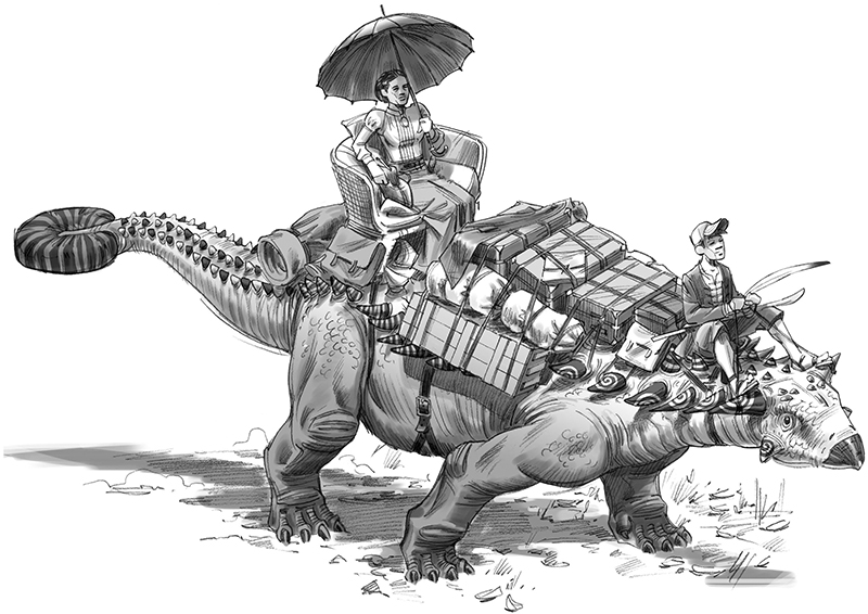 Плоские костяные чешуйки на спине Юного отлично подходили для того, чтобы складывать на них багаж. По обеим сторонам спины они постепенно становились более вытянутыми и заостренными, и последние торчали вверх и в стороны, как рога, – к ним было удобно привязывать груз. Сэмми кое-что усовершенствовал, Теодор это сразу заметил и оценил. Так, например, чтобы вещи не падали со спины Юного, в «рогах», торчавших в разные стороны, были проделаны прорези. С их помощью Сэмми зафиксировал веревку, которая, словно гигантская сеточка для волос, оплетала всю поклажу и не давала ей двигаться.