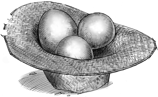 В его шляпе лежали три больших пятнистых яйца, каждое размером с грейпфрут.