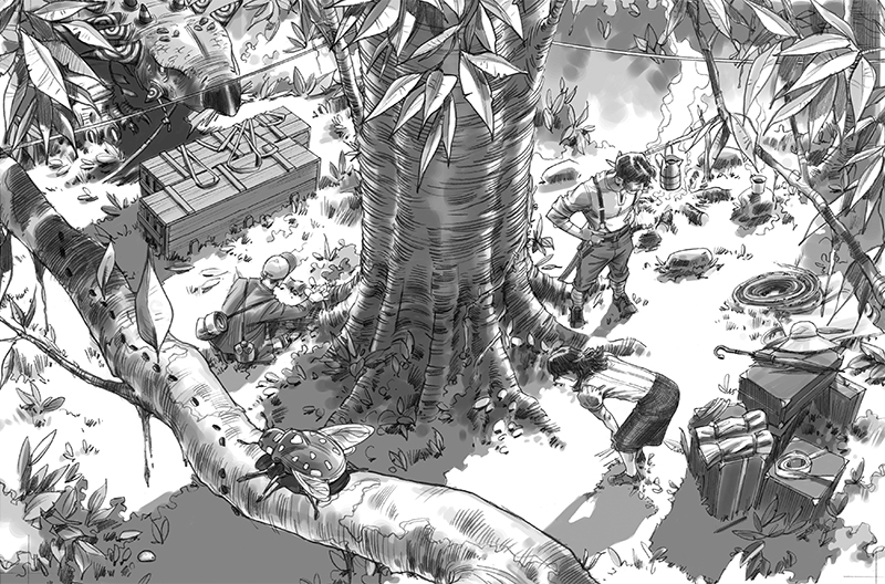 Бигги ушел вперед, чтобы удостовериться, что путь свободен. Через несколько часов вероятность того, что их могут заметить Хейтер и его люди, значительно снизилась – с каждым шагом джунгли становились гуще. Друзья поравнялись с Бигги на узкой тропинке, ведущей к небольшой поляне с деревянным навесом, под которым хранились бочки и несколько длинных деревянных ящиков. Бигги смел опавшие листья с чуть приподнятого настила и с их помощью развел костер в ямке неподалеку. Когда Юный остановился, он всех поприветствовал: