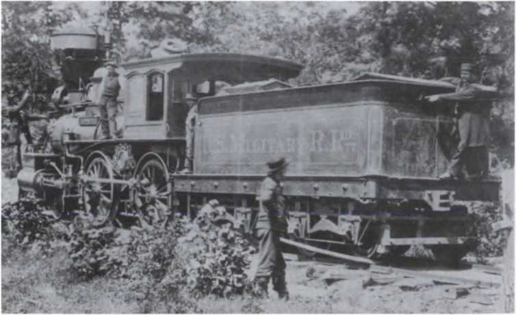 Локомотив военно-железнодорожной службы; члены паровозной бригады указывают места попадания снарядов мятежников U.S. Army Military History Institute