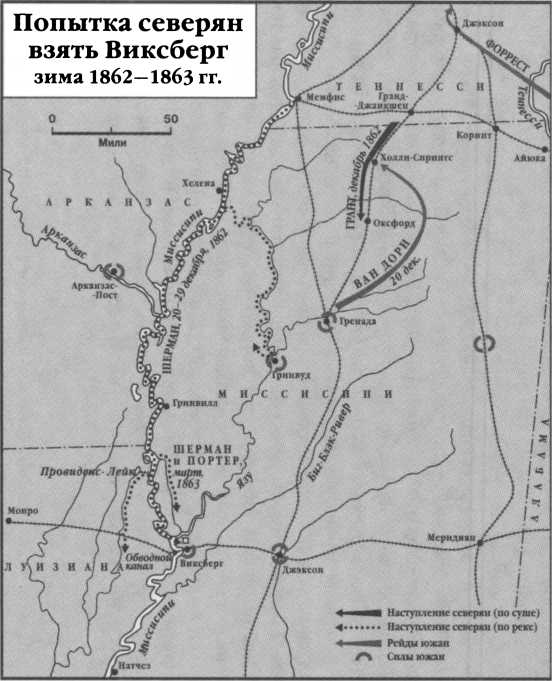 После октябрьской битвы под Коринтом Грант начал движение к югу вдоль Центральной железной дороги Миссисипи с целью захвата Виксберга. Обустроив передовую базу в Холли-Спринге, 40-тысячная армия Гранта в начале декабря подошла к Оксфорду, однако наличие сил врага перед ним и в тылу угрожало дальнейшему наступлению. Ему противостоял 20-тысячный отряд Пембертона, окопавшийся на берегу реки Ялабуша у городка Гренада. Позади Гранта осталось 150 миль железнодорожного полотна – заманчивая цель для вражеской конницы. Другая потенциальная «угроза» исходила из Иллинойса от бывшего подчиненного Гранта, «генерала от политики» Джона Макклернанда, который формировал собственную армию, чтобы спуститься вниз по Миссисипи и взять Виксберг самому. «Военный демократ», земляк Линкольна, Макклернанд убедил президента, что может разжечь патриотические чувства демократов Старого Северо-Запада, если ему предоставят независимое командование соединением. Не уведомив Гранта, Линкольн приказал Макклернанду действовать. С огромной энергией, подкрепляемой жаждой воинской славы, Макклернанд осенью набрал и направил в Мемфис десятки новых полков. Узнав об этом, Грант потребовал от своего начальства объяснений. Главнокомандующий вооруженными силами Хэллек, разделявший недоумение Гранта, телеграфировал ему, что полностью контролирует перемещение войск в своем ведомстве. Хэллек также приказал дивизиям Макклернанда образовать два корпуса под командованием самого Макклернанда и Шермана.