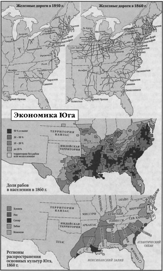 Стоит заметить, что многие плантаторы все же инвестировали средства в строительство железных дорог и фабрик, и в 1850-е годы эти предприятия процветали, однако общая тенденция состояла в сосредоточении на сельском хозяйстве и рабах. В то время как подушный доход южан с 1850 до 1860 года вырос на 62%, средняя цена за раба выросла на 70%, стоимость акра сельскохозяйственных угодий – на 72%, а капиталовложения на душу населения – лишь на 39%. Другими словами, в 1860 году южане вложили больший капитал в земли и рабов, нежели в 1850-м[185]185