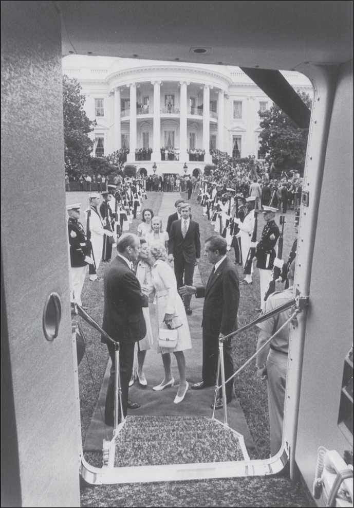 Президент Джеральд Форд и его жена Бетти провожают Ричарда Никсона и его жену Пэт из Белого дома к вертолету, припаркованному на южной лужайке Белого дома, 9 августа 1974 года. За ними стоят дочери Никсона, Триша и Джули, и их мужья. Предоставлено Национальным архивом, NLNP-WHPO-MPF-E3398–09.