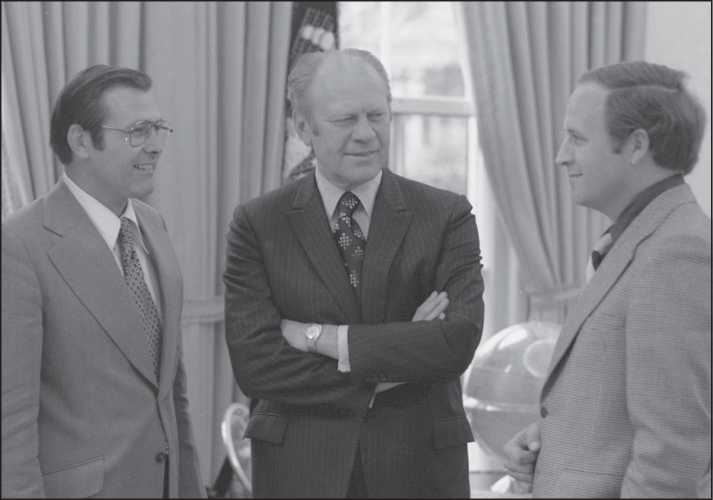 Президент Форд встречается со своим главой администрации Дональдом Рамсфелдом и заместителем главы администрации Диком Чейни (справа) в Овальном кабинете, 28 апреля 1975 года. Библиотека Джеральда Р. Форда.