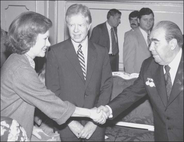 Джимми Картер, Розалинн Картер и Леонид Брежнев после подписания Договора SALT II в Вене, июнь 1979 года. Библиотека Джимми Картера.