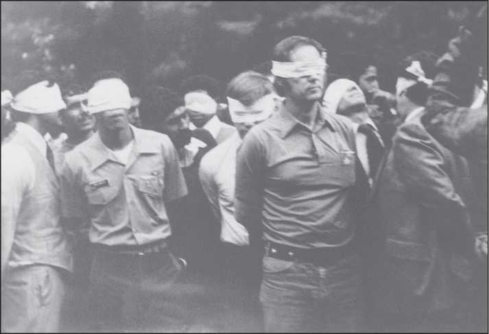 Заложников с завязанными глазами выводят из посольства США в Тегеране в первый день его оккупации, 4 ноября 1979 года. © Bettmann/CORBIS.