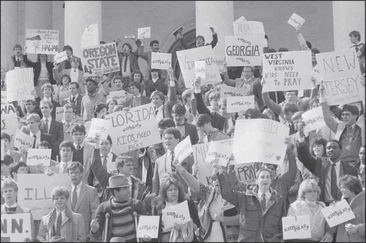Студенты, организованные организацией «Моральное большинство», проводят демонстрацию в поддержку поправки о школьной молитве. Капитолий США, март 1984 года. © Bettmann/CORBIS.
