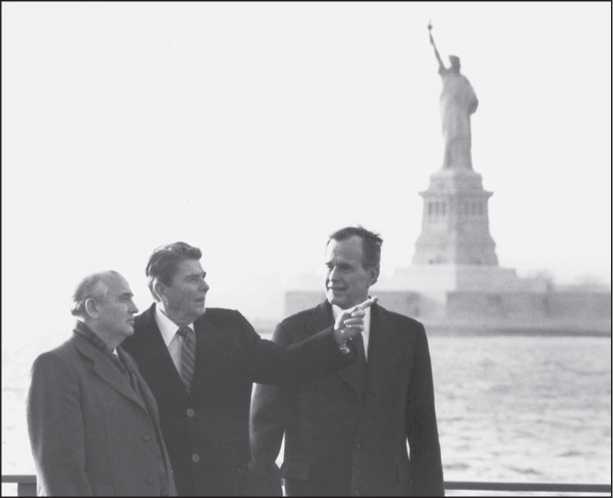Горбачев, Рейган и избранный президент Джордж Буш возле статуи Свободы, 7 декабря 1988 года. Президентская библиотека Рональда Рейгана.