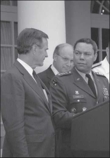 Президент Буш объявляет о назначении генерала Колина Пауэлла председателем Объединенного комитета начальников штабов с октября 1989 года. За ними министр обороны Дик Чейни. Президентская библиотека Джорджа Буша.