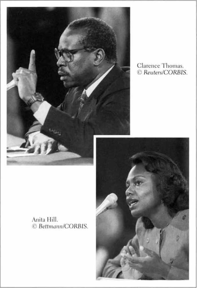 Кандидат в члены Верховного суда Кларенс Томас и профессор права Университета Оклахомы Анита Иллилл дают показания на получивших широкую огласку слушаниях по утверждению кандидатуры Томаса, которые проводились судебным комитетом Сената в 1991 году.
