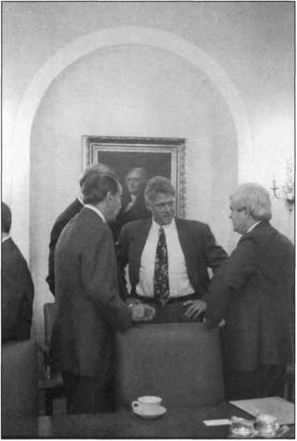 Билл Клинтон с лидером сенатской партии Робертом Доулом (слева) и представителем Ньютом Гингричем, 1993 год. Президентская библиотека Клинтона.
