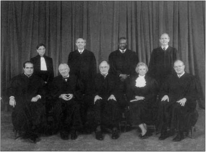 Верховный суд, ноябрь 1994 года. Задний ряд, слева направо: Рут Бейдер Гинзбург, Дэвид Х. Соутер, Кларенс Томас, Стивен Г. Брейер. Первый ряд, слева направо: Антонин Скалия, Джон Пол Стивенс, Уильям II. Ренквист, Сандра Дэй О’Коннор, Энтони Кеннеди. Коллекция Ричарда Штрауса, Историческое общество Верховного суда.