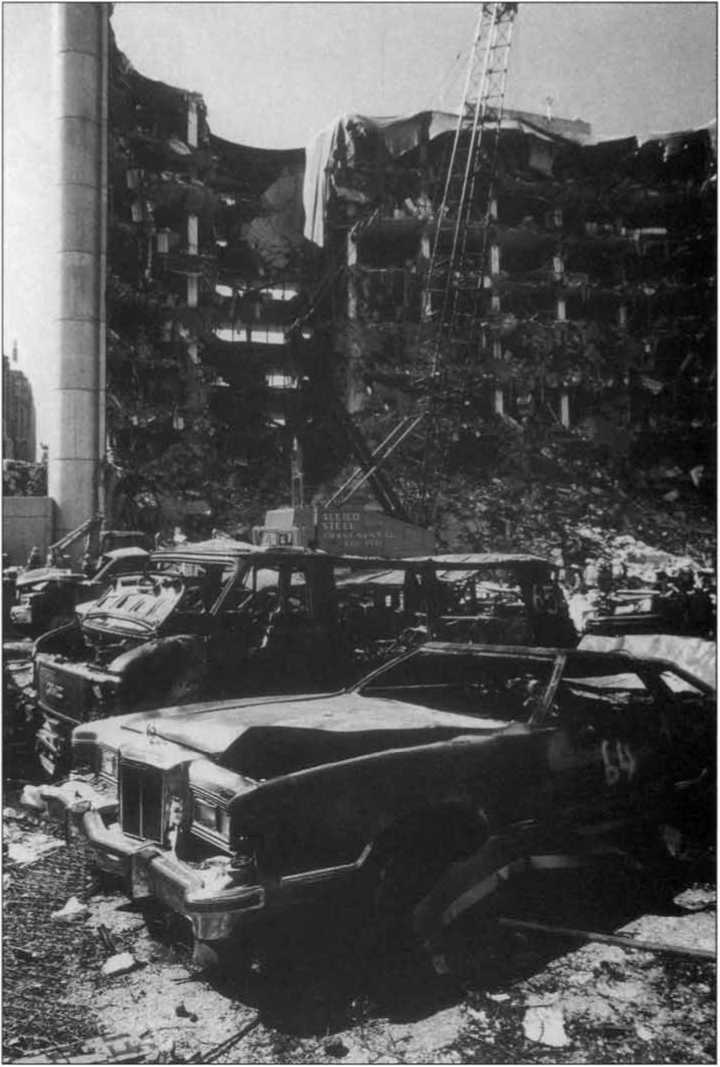 Разбитое федеральное здание в Оклахома-Сити, взорванное 19 апреля 1995 года. Штаб-сержант Дин У. Вагнер/Центр визуальной информации обороны. Риверсайд, Калифорния.