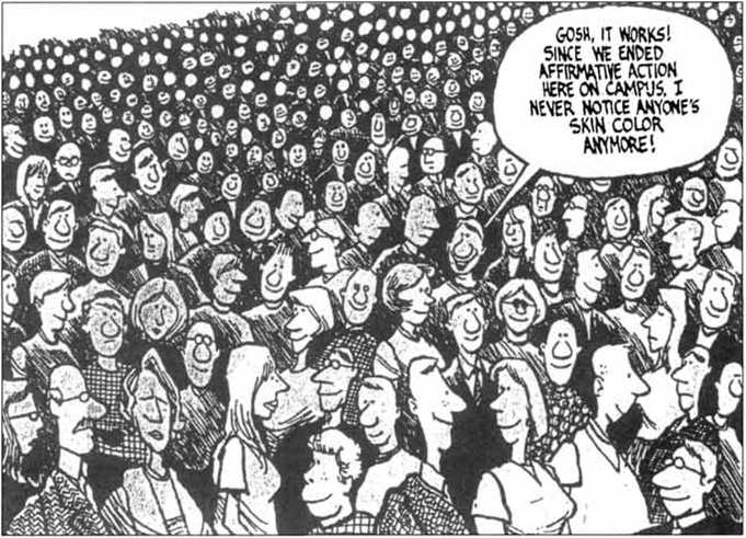 «Боже, как это здорово! С тех пор как мы покончили с позитивными действиями в кампусе, я больше не замечаю ничьего цвета кожи!» Карикатурист Майк Питерс о позитивных действиях. Дейтон Дейли Ньюс. Декабрь 1997 года. King Features Syndicate.